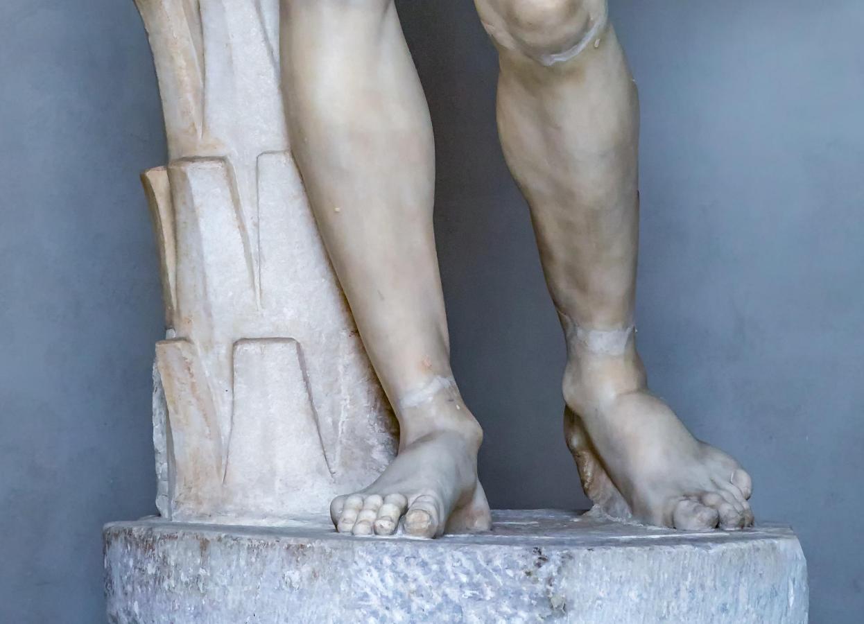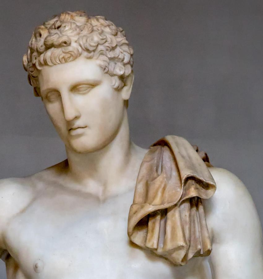 The Hermes of the Museo Pio-Clementino is an ancient Roman sculpture that belongs to the Vatican collections in Rome. It was long admired as the Belvedere Antinous. However, the idealised face is probably not that of Antinous, the lover of Emperor Hadrian. The cloak known as the chlamys, which is thrown over the left shoulder and wrapped around the left forearm, and the relaxed contrapposto identify the sculpture as a Hermes. Today, the sculpture is considered to be a Hadrianic copy (early second century AD) of a bronze by Praxiteles or one of his pupils. The sculpture was purchased for Pope Paul III in 1543. It was probably found in a garden near Castel Sant’Angelo.