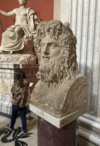 From an illustration of the bust in a book from 1792 with the long title “Il Museo Pio- Clementino descritto da Ennio Quirino Visconti Direttore del Museo Capitolino – Tomo sesto – Dedicato alla Santita di Nostro Signore PIO SESTO Pontefice Massimo. Edito da Luigi Mirri / Mercante di quadri incontro il Palazzo Bernini. In Roma MDCCXCII con Privilegio Pontificio. Opera dedicata ai Busti del Museo Pio-Clementino” shows that the bust of the sea god was already in the Hall of Busts in 1792 and that it had been found in Pozzuoli near Naples.