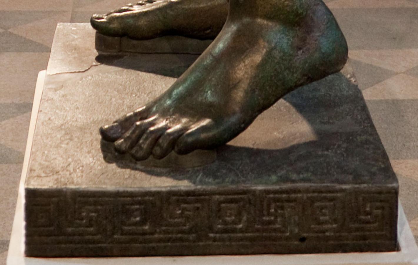 The Croatian Apoxyomenos stands 1.92 meters tall and is mounted on a 10-centimeter-high original bronze base decorated with alternating square and swastika motifs. This base design repeats three times on the sides and four times on the front, while the back remains undecorated. Art historians Nenad Cambi and Vincenzo Saladino date the statue to the 2nd or 1st century BC and attribute it to a highly skilled but unknown artist.