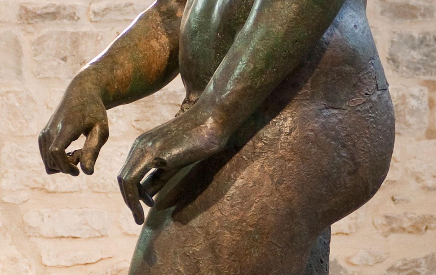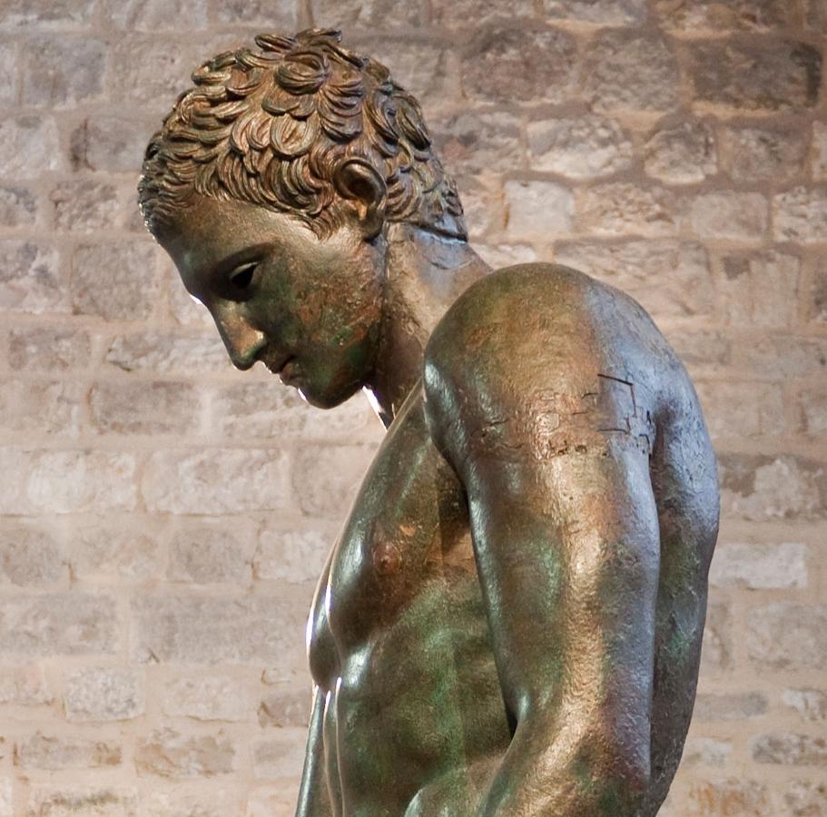 The Croatian Apoxyomenos is an ancient Greek bronze statue from the 2nd or 1st century BC, discovered underwater in 1996 near Vele Orjule, a small islet southeast of Lošinj, Croatia. It depicts an athlete, Apoxyomenos (‘the Scraper’), who is cleaning himself with a strigil, a small curved instrument used to scrape off sweat and dust.