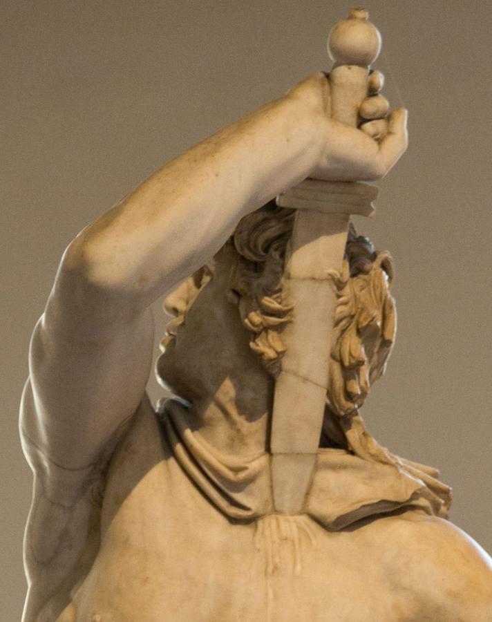 The Ludovisian Gaul is a marble statue of a Gaul who kills himself and his wife, also known as “The Galatian Suicide”. The Gaul is depicted at the moment when he plunges a sword into his chest and looks defiantly backwards while supporting the dying figure of his wife with his left arm. This is a Roman copy from the early 2nd century A.D. of a Hellenistic bronze original (ca. 230-20 B.C.). One of the bronze statue groups that Attalus I commissioned from Greek sculptors after his victories over the Gauls in Galatia. The Ludovisian Gaul was probably created by the sculptor Epigonus from Pergamon.