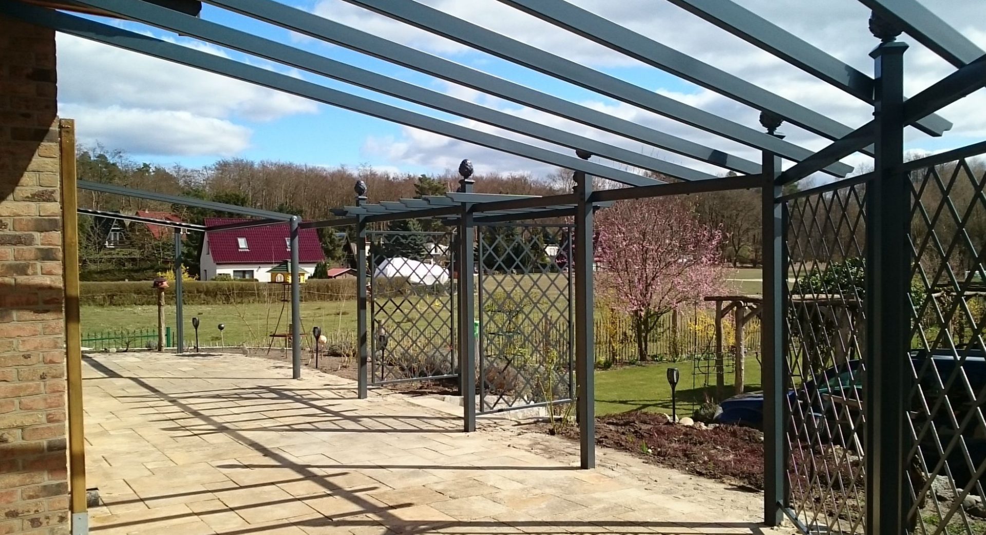 A pergola is a shielded walkway supported by pillars, which usually connects a house to part of the garden, such as a terrace or patio. Traditionally it is a lean-to-structure attached to a wall and – in contrast to an arbour – is not free-standing. From ancient times and particularly since its rediscovery in the Renaissance, it has been prized as a special feature of ornamental gardens. To the present day, it has been used both as a support for grapevine, wisteria or rambler roses and as a space divider in private gardens and public parks. The typical wooden pergola weathers quickly and, once it is covered with plants, it is impossible to apply the (often aggressive) protection agents that wood needs outdoors. Wooden structures also tend to look more rustic, which may not harmonize so well with the metropolitan flair of so many of today’s gardens.