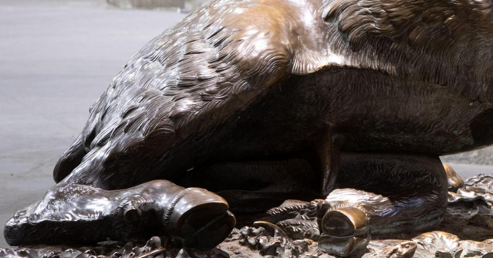 Visitors to Il Porcellino throw a coin into the boar’s gaping mouth to drop it through the grille below for good luck, and they rub the boar’s snout to ensure a return to Florence – a tradition noted by the Scottish traveller Tobias Smollett as early as 1766, which has preserved the snout in a state of polished lustre while the rest of the boar’s body is patinated to a dull brownish green.
