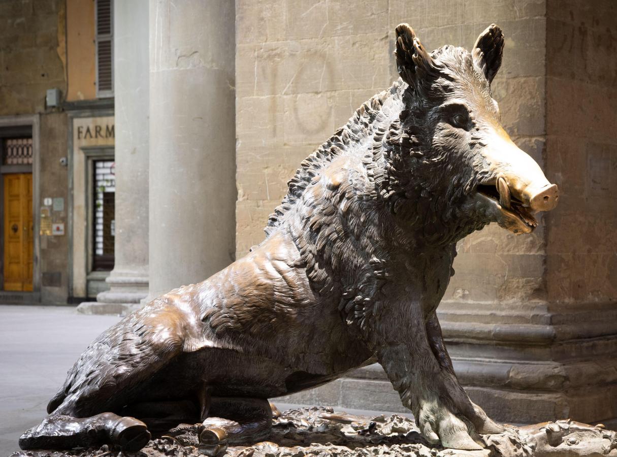 Il Porcellino (“The Piglet”) or “The Wild Boar” is the local Florentine nickname for a bronze fountain with a boar. The fountain figure was created by the Baroque master Pietro Tacca (1577- 1640) shortly before 1643. It was modelled on a Roman marble statue made of Pentelic marble dating back to the early imperial period (1st century AD). This in turn was modelled on a lost Greek bronze sculpture from the Middle Hellenistic period.