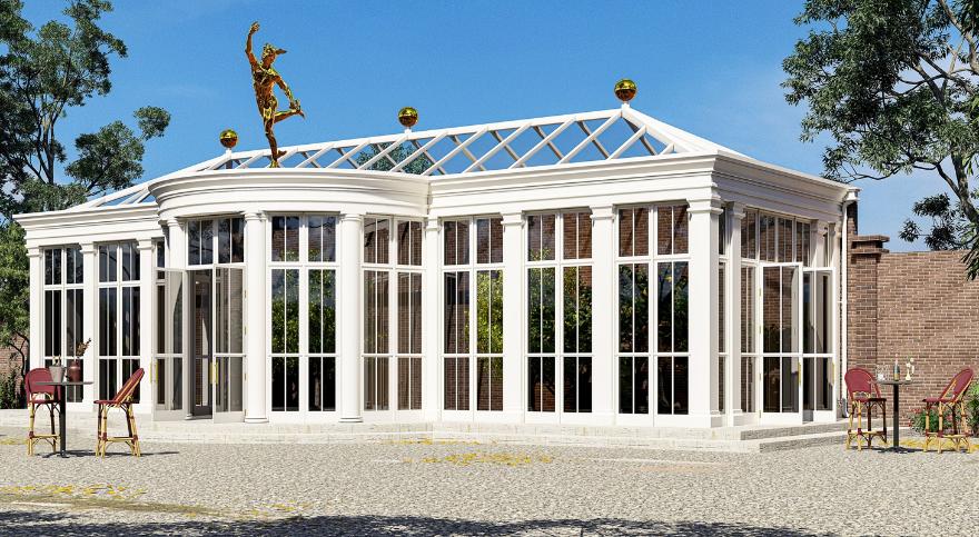 Bespoke in its dimensions, the orangery shown here measures 18 metres in width and 6.20 metres in depth (excluding the entrance), with a height of 6.20 metres. The entrance spans 6 metres.